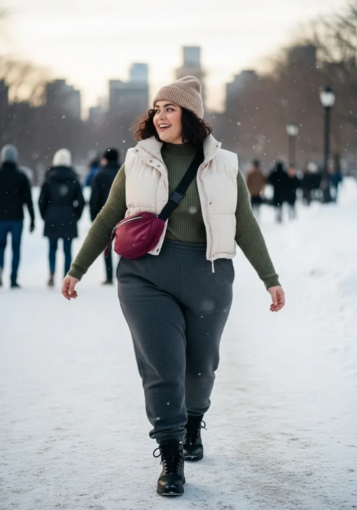 This outfit blends comfy pieces with a casual winter vibe in the best way. She is wearing a soft ribbed olive green sweater that adds warmth without feeling bulky. The cream puffer vest brings a light and airy layer that brightens the whole look. The dark gray joggers keep everything relaxed and practical for cold weather. Her black winter boots are sturdy enough for snowy sidewalks. The beige knit beanie and the berry toned crossbody bag add personality and a little pop of color that feels joyful on a winter day.