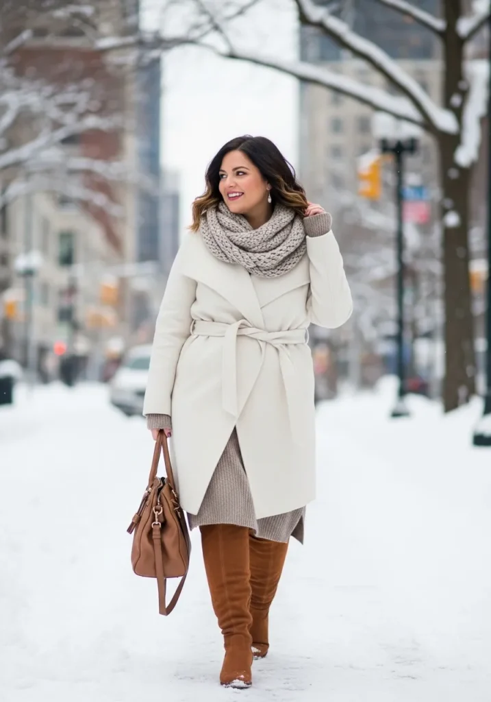 This outfit is such a winter dream with its soft creamy palette and warm layered textures. She is wearing a beautifully structured off white wrap coat with a tie belt that pulls everything in at the waist in the most flattering way. Underneath is a ribbed knit sweater dress in a cozy oatmeal shade that peeks out just enough to add dimension. The chunky knit infinity scarf feels snug and plush. The look finishes with rich caramel over the knee suede boots and a matching tote bag that adds a warm contrast against the snow. The whole vibe feels polished and effortlessly elegant while still being completely practical for cold days.