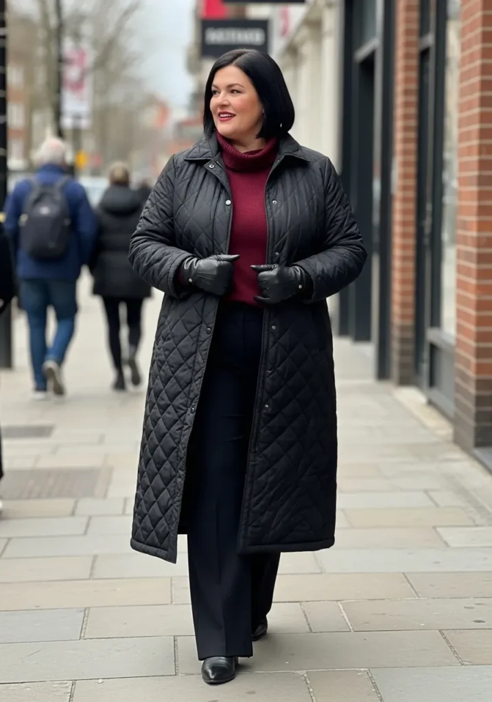 This look brings together a long black quilted coat with a sleek, structured shape that feels instantly polished. Underneath, the rich burgundy turtleneck sweater adds warmth and color without overpowering the outfit. The black tailored trousers keep everything streamlined while the leather gloves and matching boots tie the whole look together. The overall vibe is classic city winter with a hint of quiet luxury.