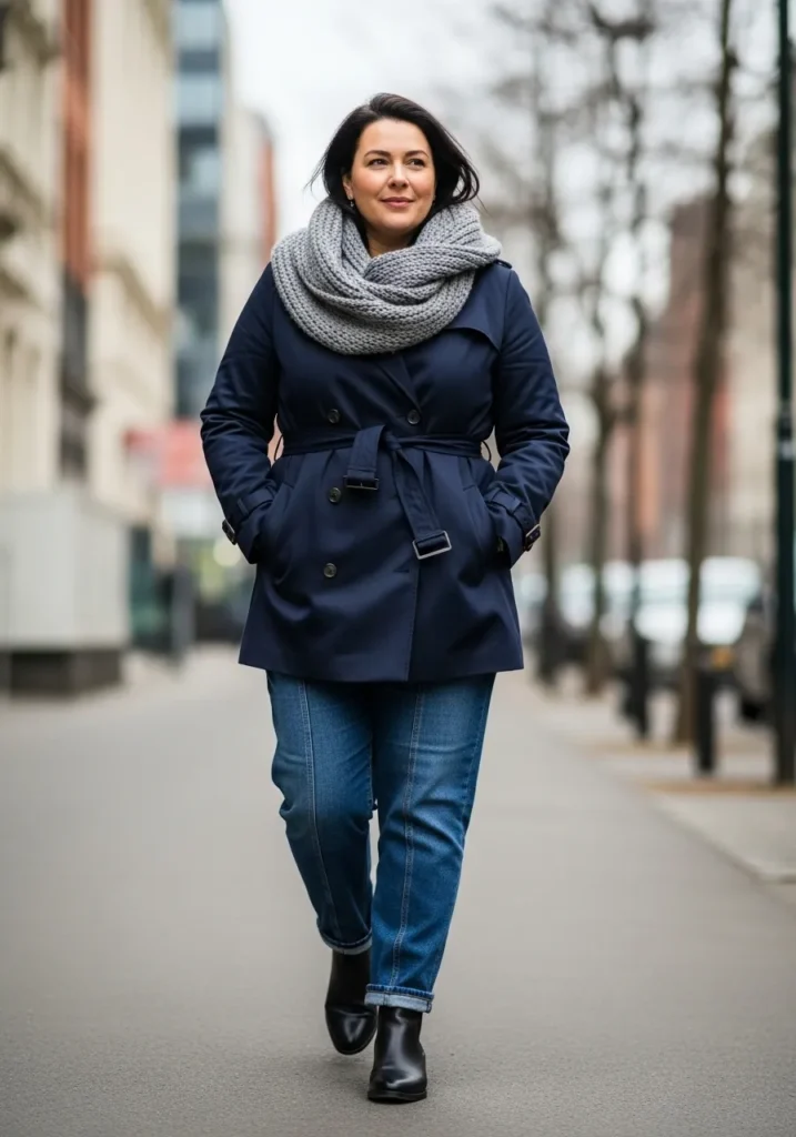 Classic Navy Trench With a Cozy Knit Scarf
