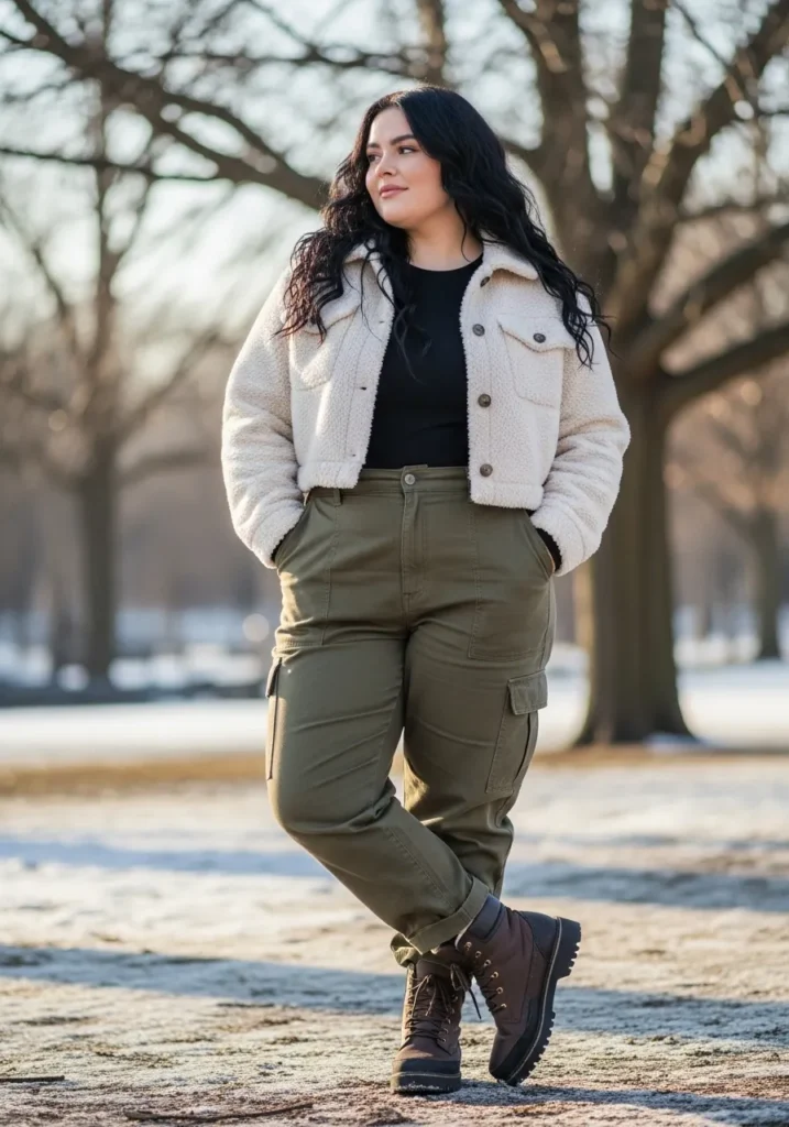 This outfit mixes warmth with a little outdoor attitude. The cropped sherpa jacket in soft cream feels plush and cozy, especially paired with a fitted black top that keeps everything sleek underneath. The high waisted olive cargo pants add that practical winter vibe with their structured pockets and comfy relaxed fit. Brown lace up winter boots finish the look with a rugged touch that still feels cute for a casual cold weather day. The whole outfit strikes that perfect balance of laid back and put together, like a stroll through the park but make it stylish.