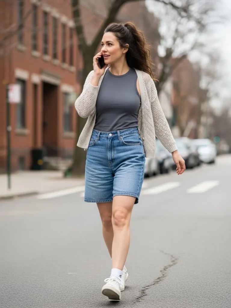 This outfit pairs a cozy neutral cardigan with a fitted top and classic denim shorts.