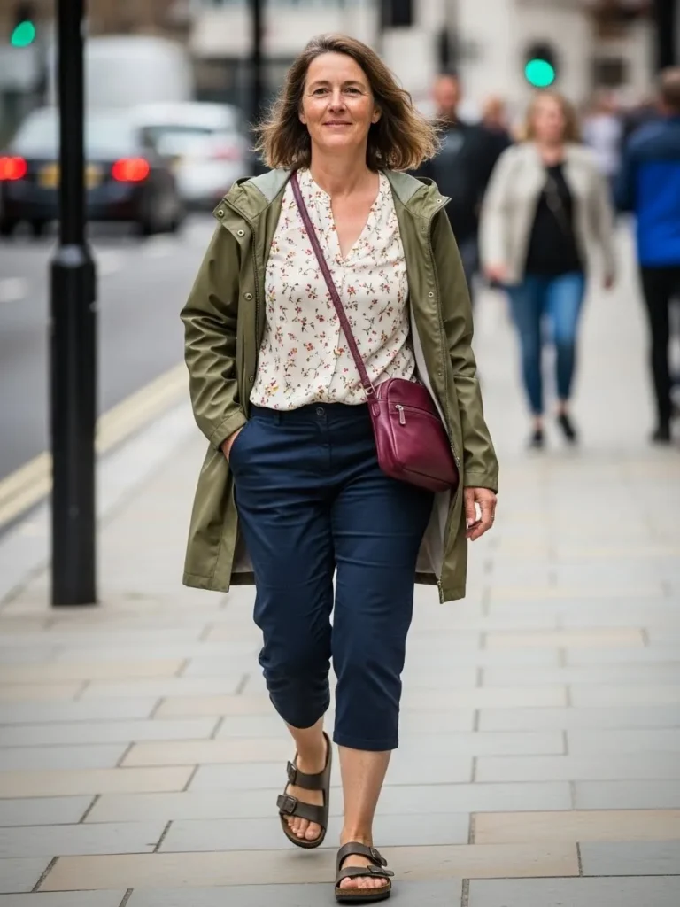 Neutral tones and comfortable footwear make it ideal for rainy walks.