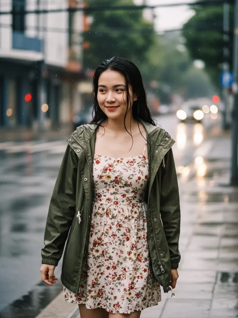 This look feels cute, modern, and perfect for warm rainy days when heavy layers feel wrong.