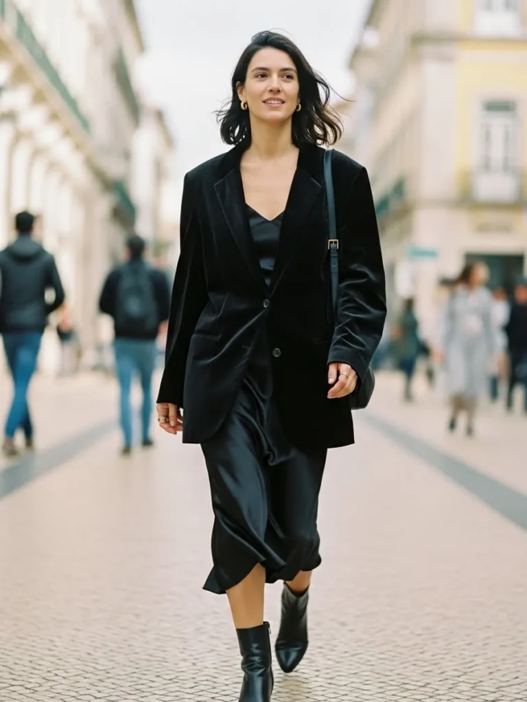 This ensemble showcases a luxurious black velvet blazer layered over a satin slip dress. The soft sheen of the satin contrasts beautifully with the rich texture of the velvet, creating a sophisticated and feminine look. Paired with black ankle boots, this outfit exudes modern elegance while keeping comfort at the forefront.