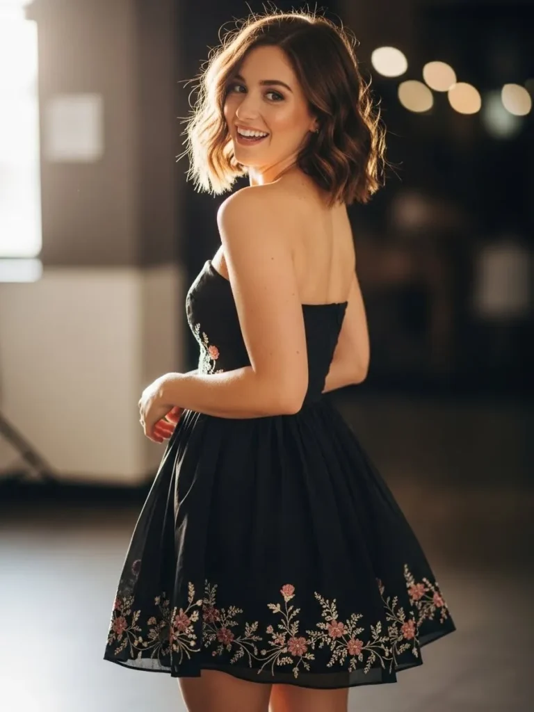 This sweet strapless black dress features delicate floral embroidery along the hem, adding a romantic and playful touch. The fitted bodice and flared skirt create a flattering silhouette, while the soft fabric gently flows, making it a perfect choice for an effortless yet feminine look. The soft lighting accentuates the warmth of the dress, making it ideal for a fun and flirty Valentine’s Day date.
