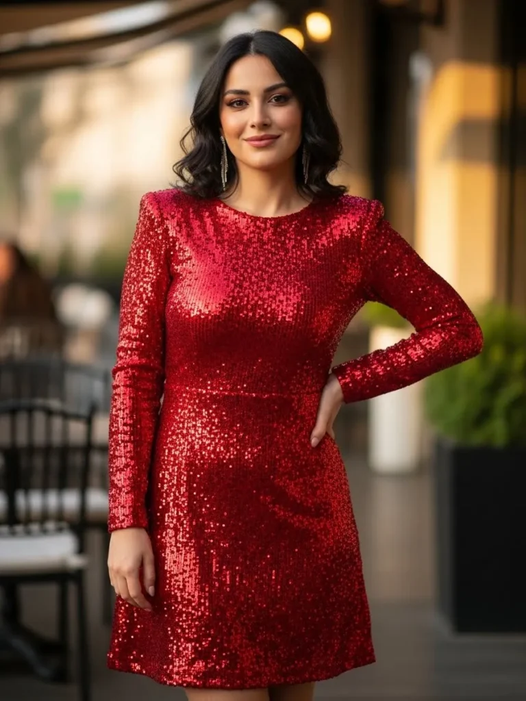 This red sequin dress is all about making a statement. The long sleeves and fitted silhouette create a sleek, flattering shape, while the sequins catch the light beautifully, adding just the right amount of glamour. The warm, outdoor lighting enhances the shimmer of the sequins, making this dress an eye-catching choice for a Valentine’s night out.