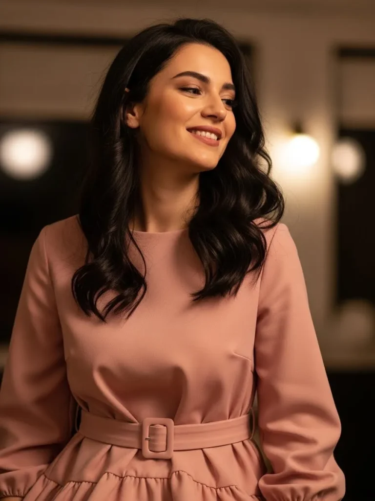 This soft pink dress features a cinched waist with a stylish belt that enhances the figure. The flowy skirt and gentle fabric create a relaxed, feminine silhouette, making it perfect for a Valentine’s Day date that’s both comfortable and chic. The soft indoor lighting highlights the dress’s delicate details.