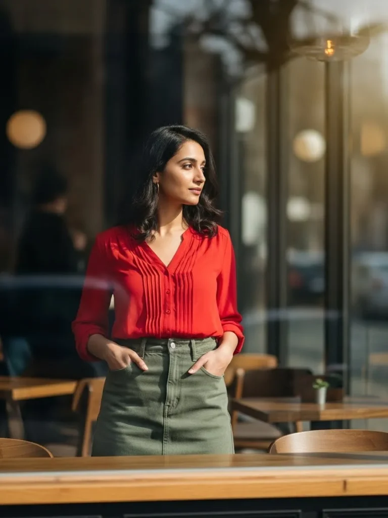 This look pairs a vibrant red blouse with a high-waisted green skirt for a fun and fresh combination. The blouse has a subtle pleated detail that adds texture, while the green skirt contrasts nicely, creating a playful yet sophisticated vibe. The bright natural lighting outside brings out the rich colors of the outfit, making it ideal for a laid-back Valentine’s brunch or casual date.
