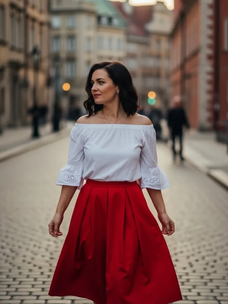 I love how the combination of the off-the-shoulder top with the full red skirt feels so lighthearted and romantic. The pairing of white and red is classic, but the modern twist with the off-the-shoulder detail keeps it feeling fresh. It’s ideal for someone who wants a fun, feminine look without feeling too formal.