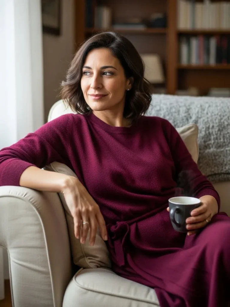 This cozy burgundy sweater dress is a stylish yet comfortable choice for Valentine’s Day. The rich burgundy color feels festive, and the soft knit fabric ensures warmth without sacrificing style. It’s paired with a casual cup of coffee, making this a perfect at-home or relaxed date night outfit.