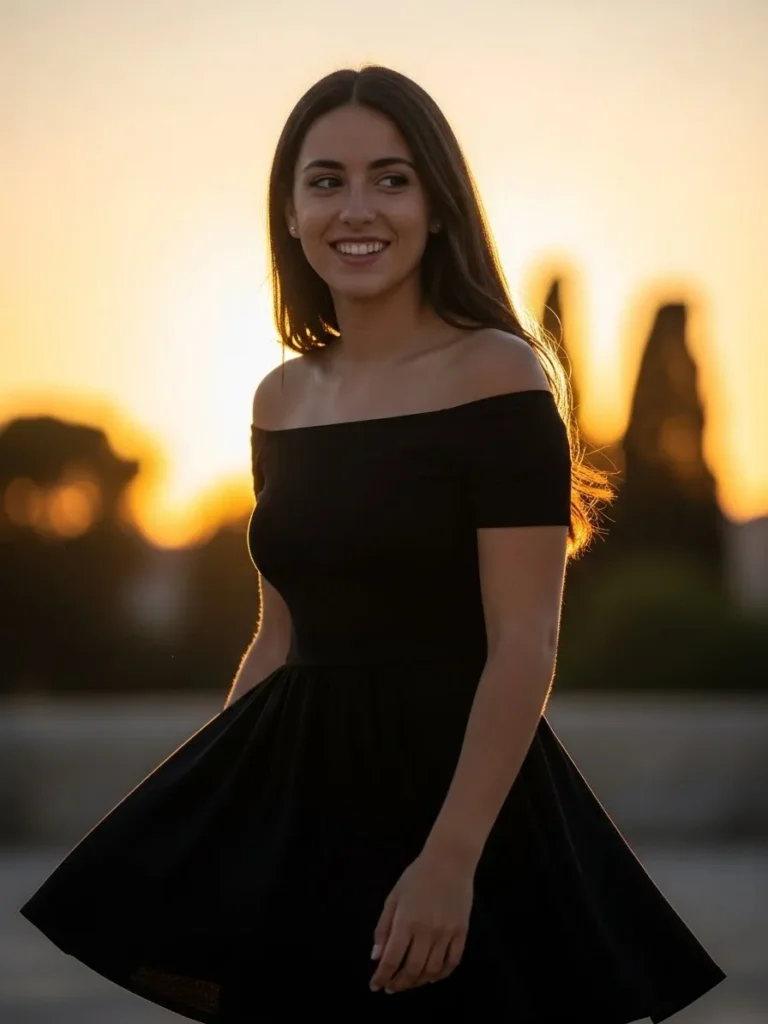 This off-the-shoulder black dress is a perfect balance of simple and stunning. The dress gently flares out at the bottom, creating a flattering silhouette while maintaining a casual elegance. The natural, glowing sunlight in the background adds warmth to the already chic vibe of the outfit.