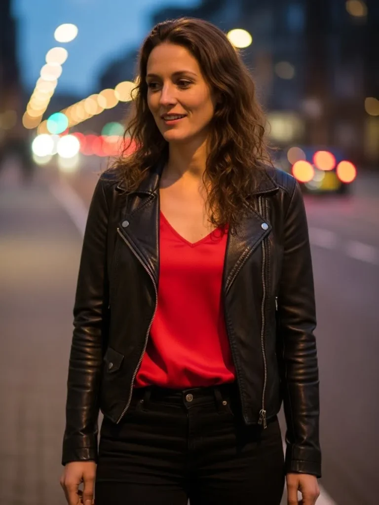 This outfit features a sleek black leather jacket paired with a bold red top and black jeans. The soft, relaxed fit of the top contrasts perfectly with the structured jacket, creating a chic yet comfortable vibe. The black jeans provide a balanced base, making this outfit a versatile choice for any occasion.