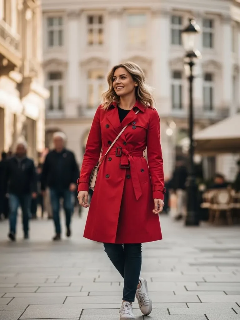This look features a bold red trench coat, paired with dark jeans and casual white sneakers. The trench coat adds an elegant touch while keeping the overall look relaxed and easy-going. The bright red color makes a striking statement, especially when paired with the simplicity of the sneakers and jeans. The street setting adds to the cool, effortless vibe of the outfit.