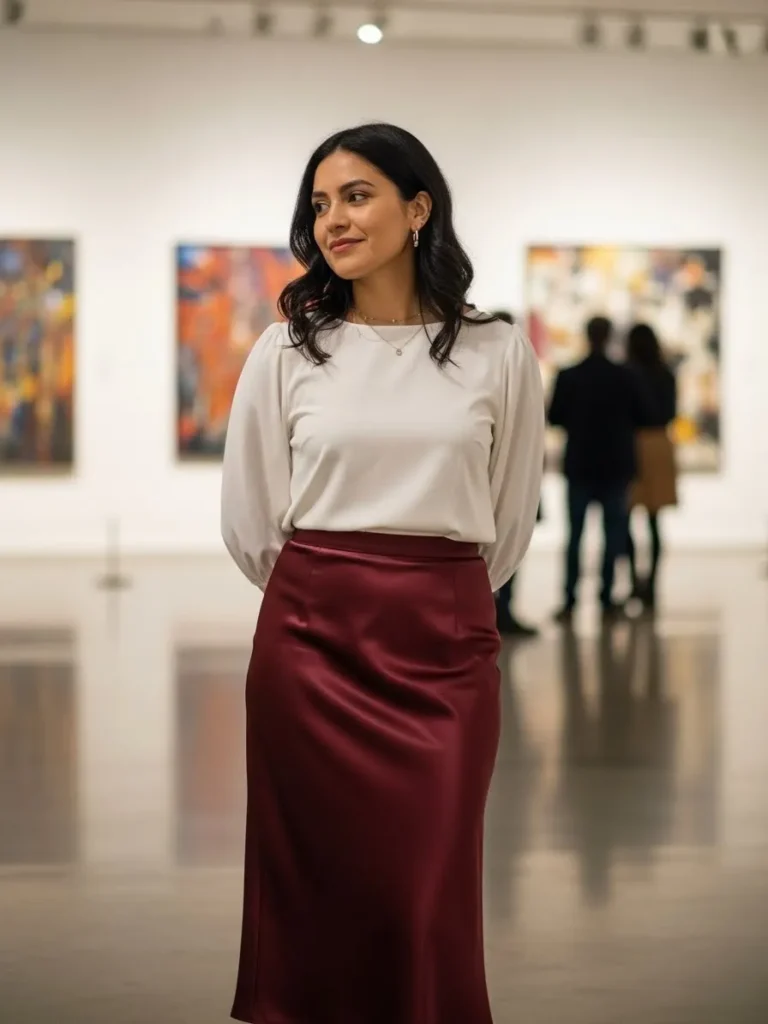 I love how this combination feels polished and elevated while remaining understated. The satin burgundy skirt adds a touch of romance, while the white blouse keeps it fresh and balanced. It’s an effortlessly chic look that works beautifully for a formal dinner or art gallery date.