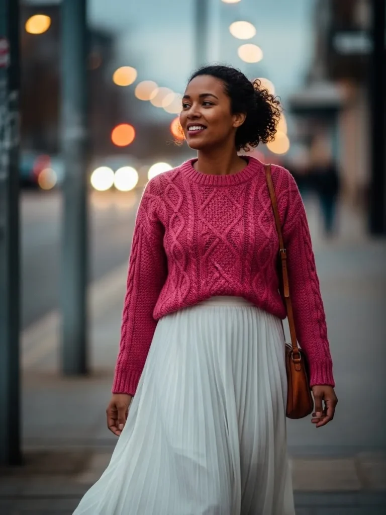 This outfit pairs a cozy pink knitted sweater with a flowing white pleated skirt. The soft knit sweater adds warmth and comfort, while the pleated skirt creates movement and femininity. The combination of the vibrant pink with the fresh white gives off a playful yet elegant vibe, perfect for a daytime Valentine’s Day celebration.