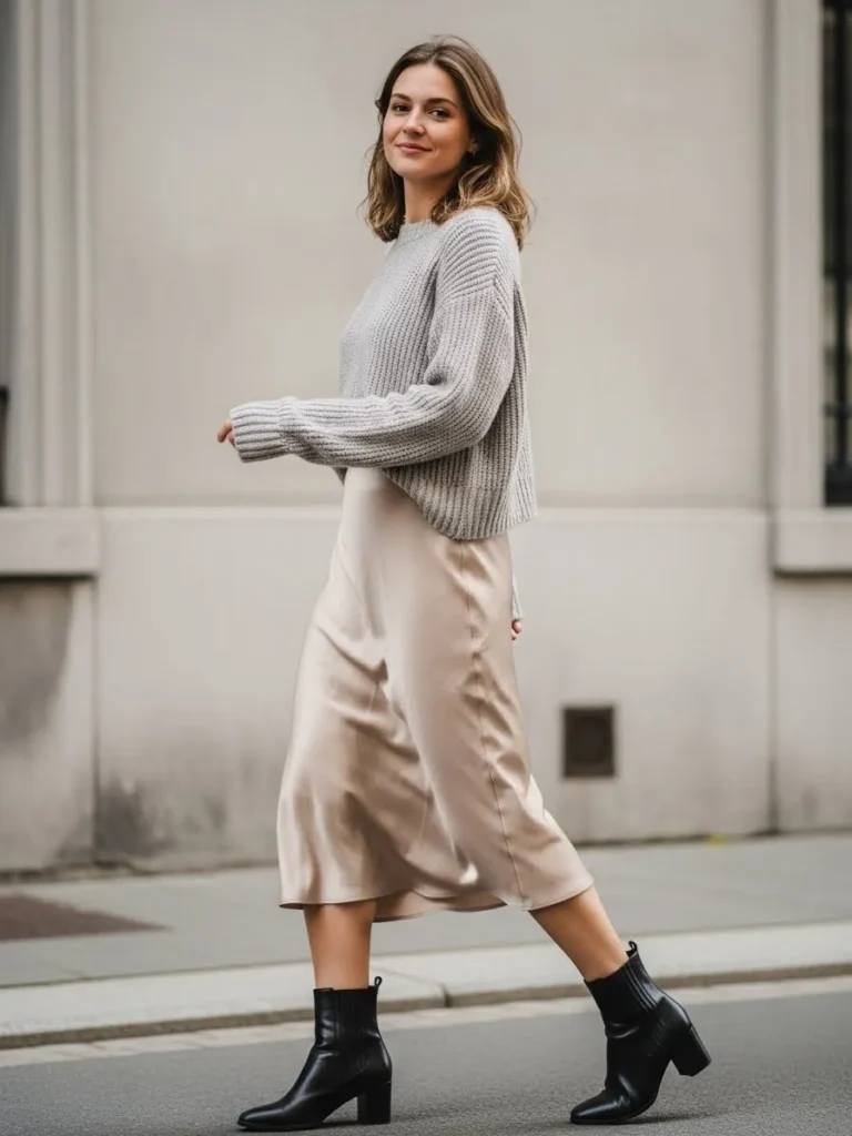 This outfit pairs a chunky light gray knit sweater with a soft satin midi skirt in a warm beige tone and black ankle boots.