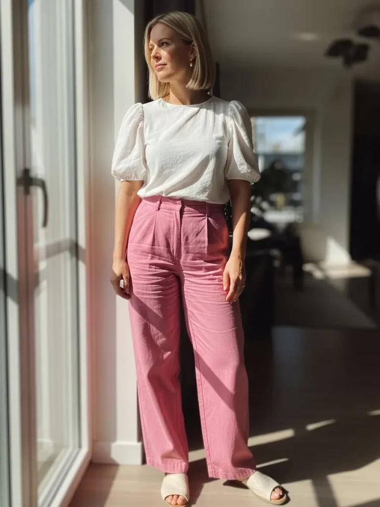 This outfit features a crisp white puff sleeve blouse tucked into relaxed blush pink trousers with a high waist and subtle structure.