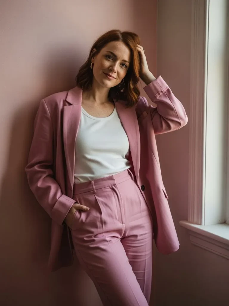 The tailored blazer and matching trousers create a polished silhouette while the soft color keeps it feminine.
