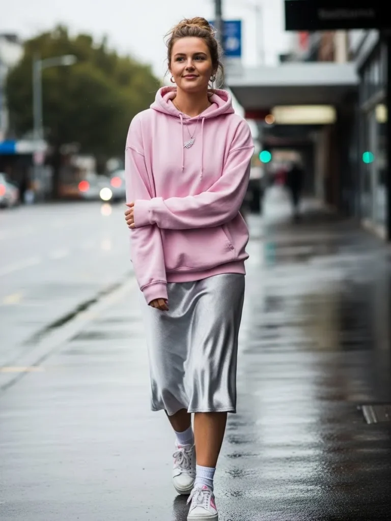 This outfit mixes a soft pink hoodie with a silver satin midi skirt and classic white sneakers for an unexpected but super cute combo.