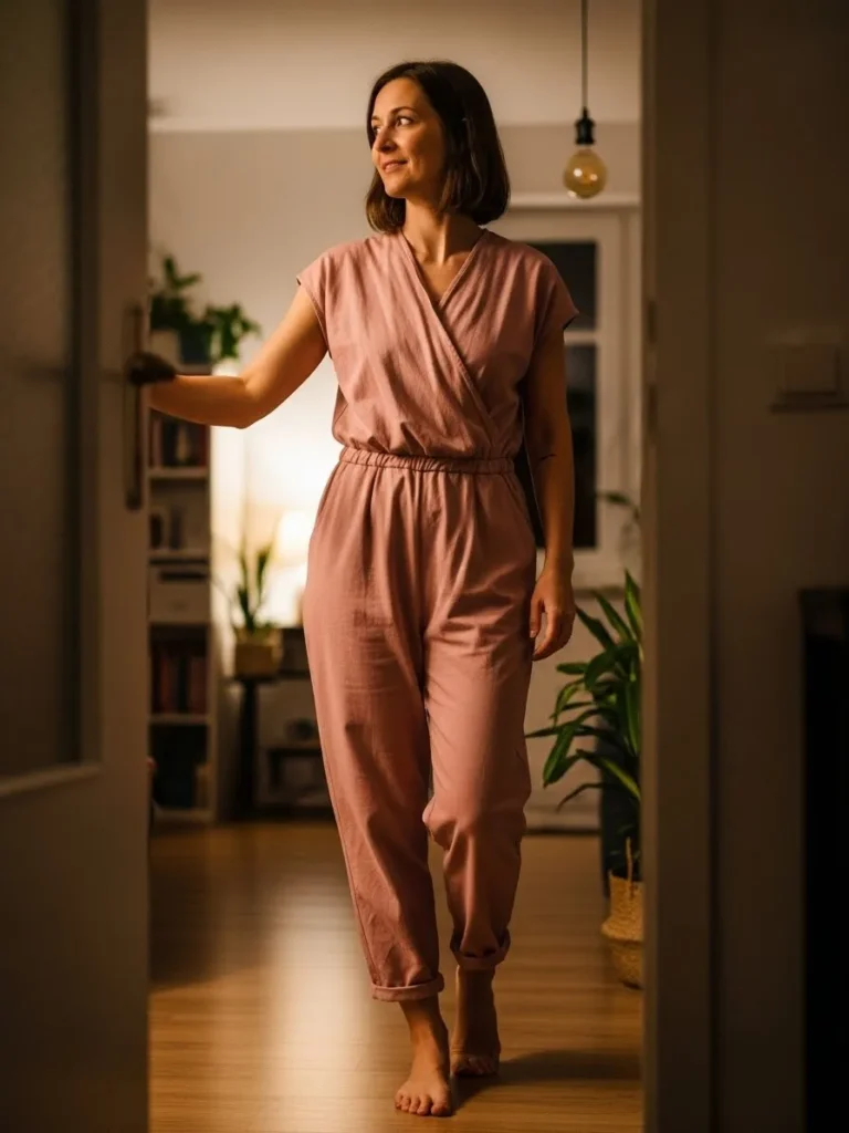 This look features a blush toned jumpsuit with a wrap style top and gently tapered legs, styled casually indoors. The fabric looks soft and breathable, giving the outfit a relaxed silhouette that still feels thoughtfully put together.