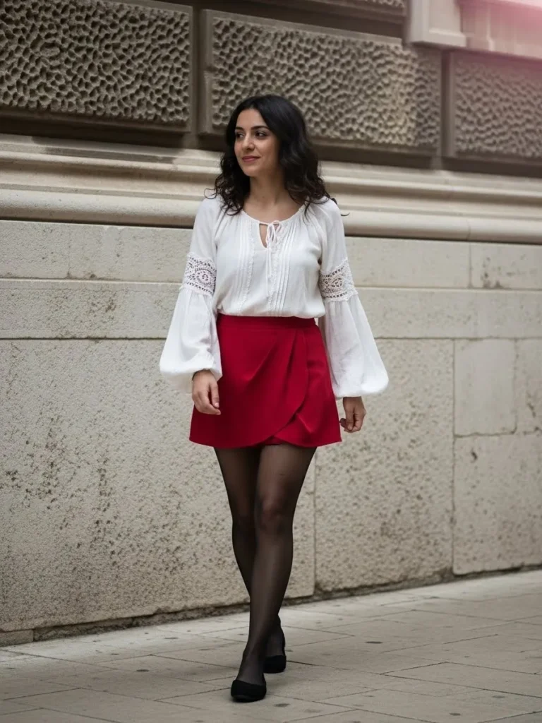 This outfit pairs a white blouse with delicate lace details and billowy sleeves with a bold red mini skirt.