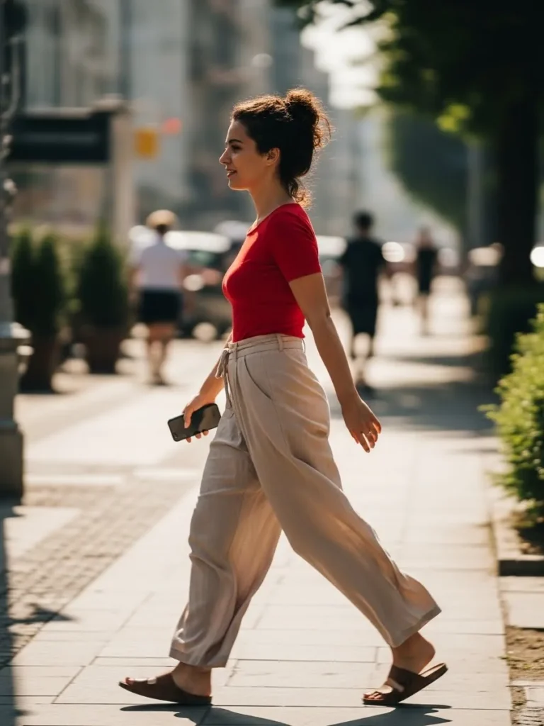 This look features a simple red short sleeve top paired with relaxed beige trousers and flat sandals.