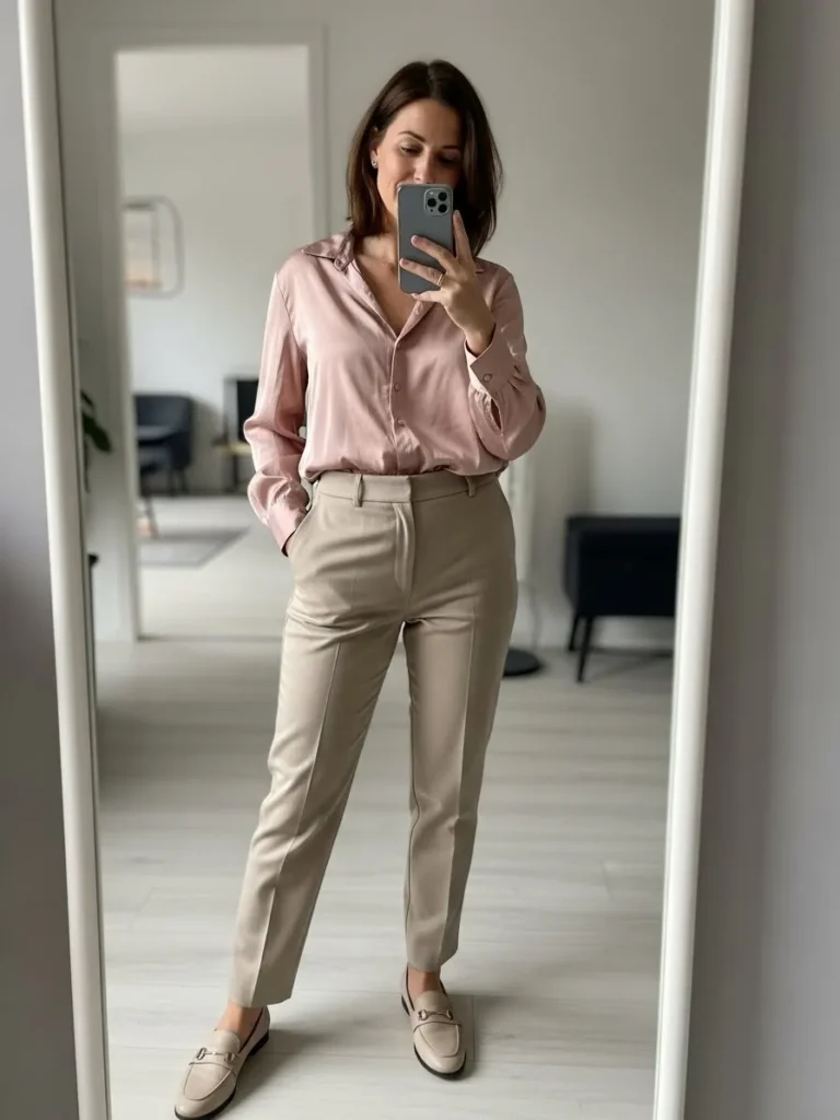 This look pairs a silky blush button down shirt with tailored beige trousers and simple loafers.