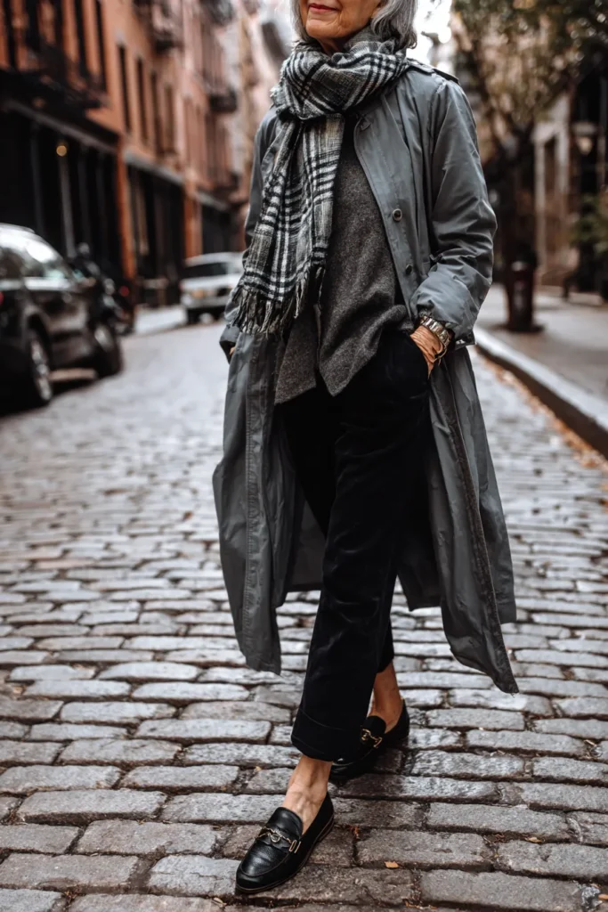 This outfit feels like the definition of cool-weather elegance. She’s wearing a long gray trench coat over a soft charcoal sweater, paired with cuffed black trousers and polished black loafers. The plaid scarf ties everything together perfectly, adding pattern and warmth while keeping the color palette calm and timeless. The outfit has that “city stroll on a crisp morning” vibe that feels stylish without trying too hard.