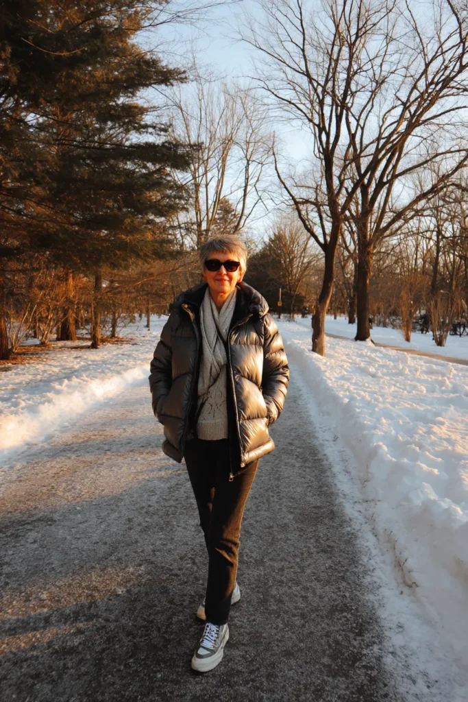 This look nails that perfect blend of cozy and cool. She’s wearing a shiny charcoal puffer jacket layered over a chunky gray cable-knit sweater, paired with black straight-leg pants and casual sneakers. The neutral tones feel effortless, and the sunlight bouncing off the metallic fabric gives it a touch of modern flair. Her short haircut and sunglasses add to the sleek, confident vibe, making this a go-to winter uniform for staying warm without losing style.