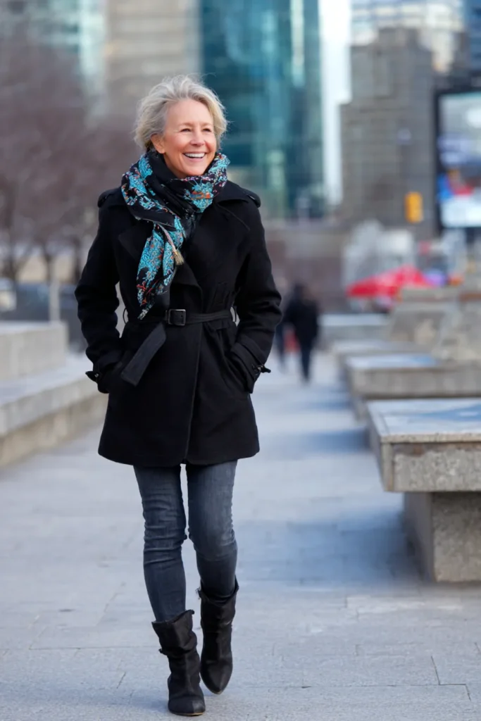 This look is the perfect example of how a simple outfit can feel instantly elevated with the right accessory. She’s wearing a belted black coat that defines the waist beautifully, paired with dark skinny jeans and sleek black boots. The real star of the outfit is the vibrant patterned scarf in shades of turquoise and coral, adding color and energy to the classic winter black-on-black base. Her short hair and warm smile make the whole look effortlessly fresh.