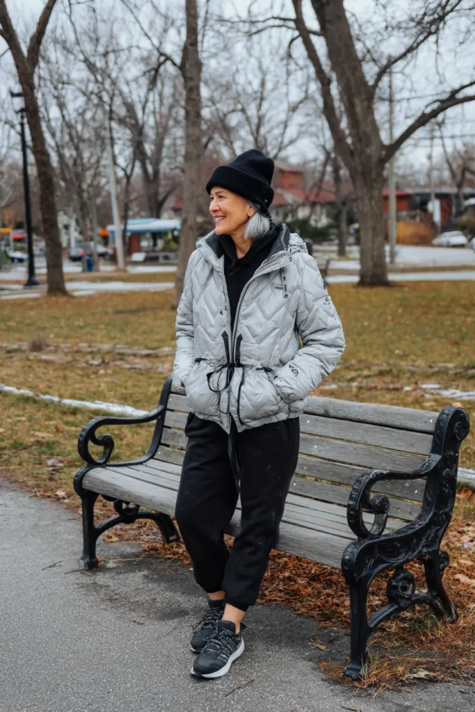 This outfit is the perfect example of how to look cozy and put-together without trying too hard. She’s wearing a light gray quilted puffer jacket with a cinched waist, paired with relaxed black joggers and comfy sneakers. The black beanie ties the look together while adding that extra bit of winter practicality. The whole outfit feels laid-back but still intentional, perfect for a chilly walk in the park or running errands on a brisk day.