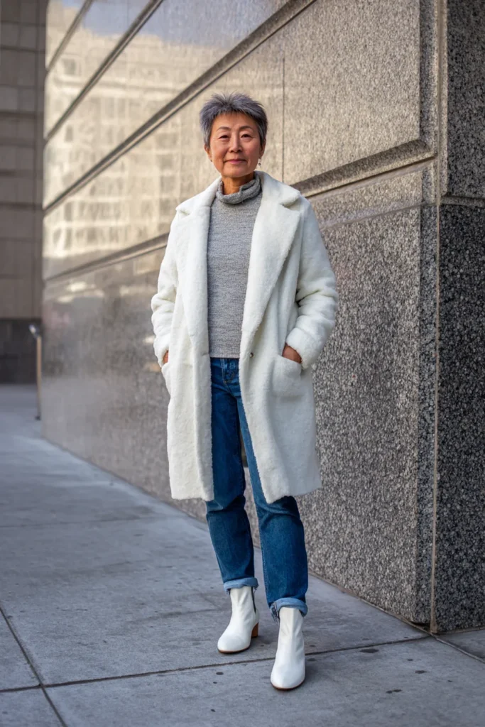 This outfit is a beautiful mix of clean lines and cozy textures. She’s wearing a plush off-white coat over a light gray knit sweater, paired with cuffed blue jeans and crisp white ankle boots. The soft tones create a fresh winter palette that feels modern and uplifting, while the simple styling keeps everything timeless. The combination of neutrals against the city backdrop makes the look feel effortlessly chic.