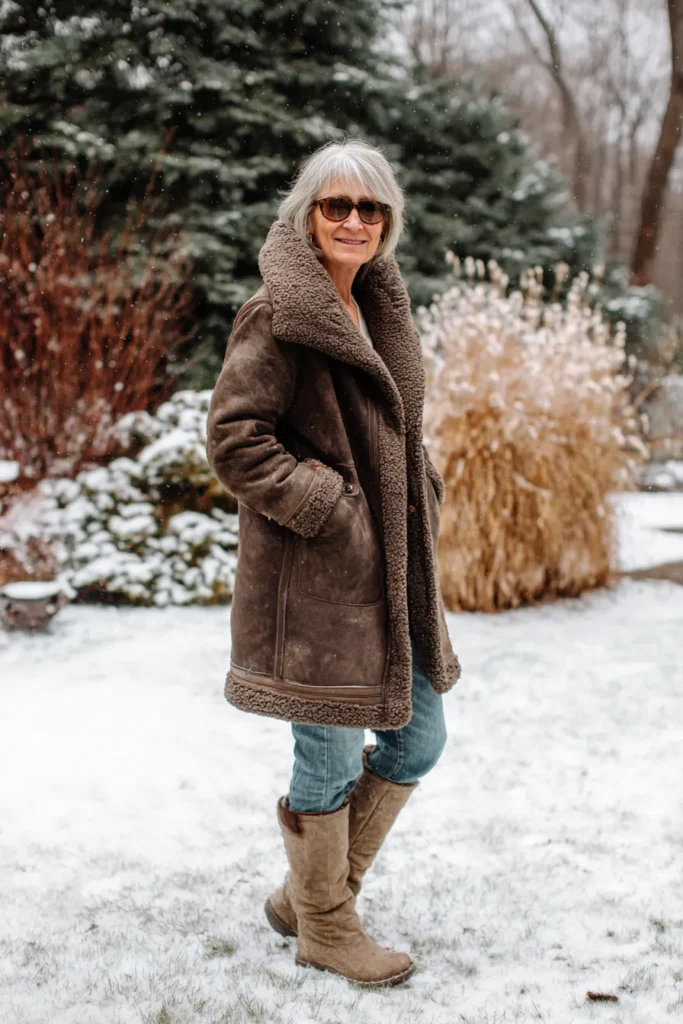 This outfit captures that cozy countryside vibe perfectly. She’s wearing a brown shearling coat with soft textured lining, paired with slim blue jeans and tall tan boots that add warmth and structure. The muted tones work beautifully against the snowy backdrop, and her relaxed smile and sunglasses bring a touch of effortless confidence to the whole look. The outfit feels timeless, practical, and full of personality.