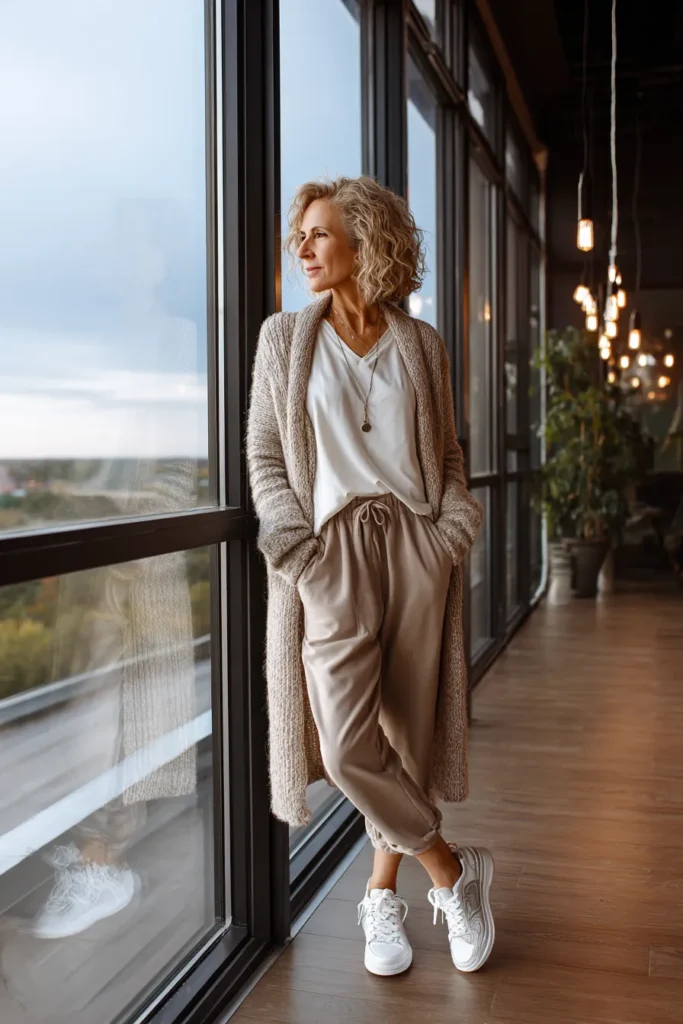 This outfit is the perfect balance of comfort and polish. She’s wearing soft beige jogger-style pants paired with a crisp white V-neck top and a long knitted cardigan in a matching neutral tone. The white sneakers keep the look fresh and casual, while the simple gold necklace adds just the right hint of elegance. The overall vibe is cozy yet refined, ideal for laid-back winter days that still call for a bit of style.