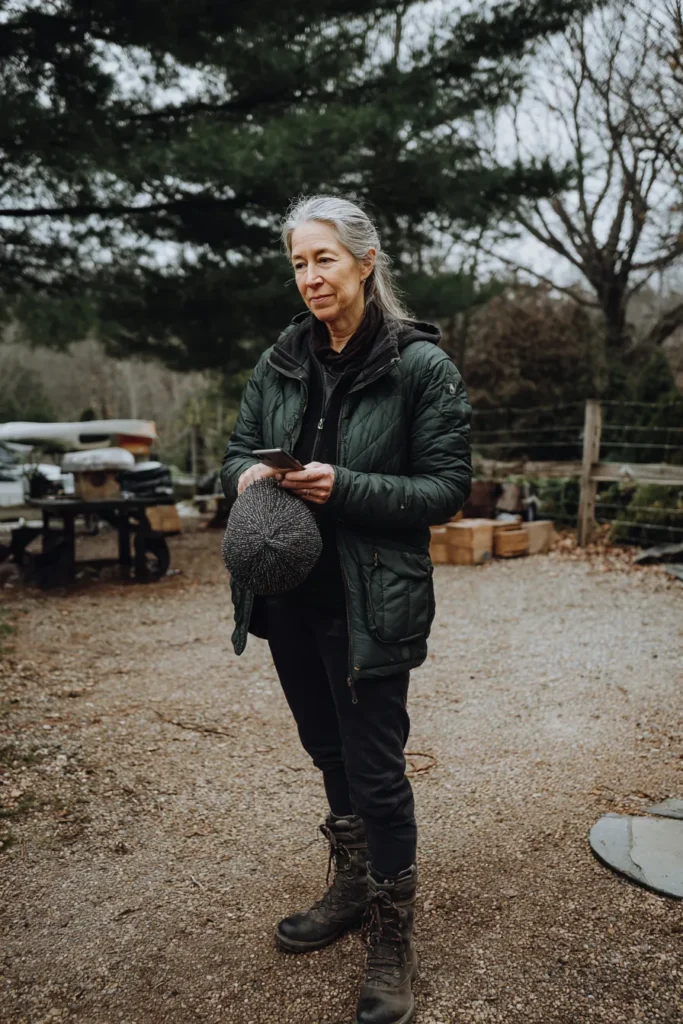 This outfit is perfect for staying warm while keeping things functional. She’s wearing a quilted dark green jacket layered over a black hoodie, paired with slim dark pants and sturdy lace-up boots that can handle any terrain. The muted tones and simple layering make the look feel unfussy and grounded, while the beanie in her hand adds a cozy finishing touch. It’s the kind of winter outfit that’s ready for errands, dog walks, or a weekend out in the countryside.