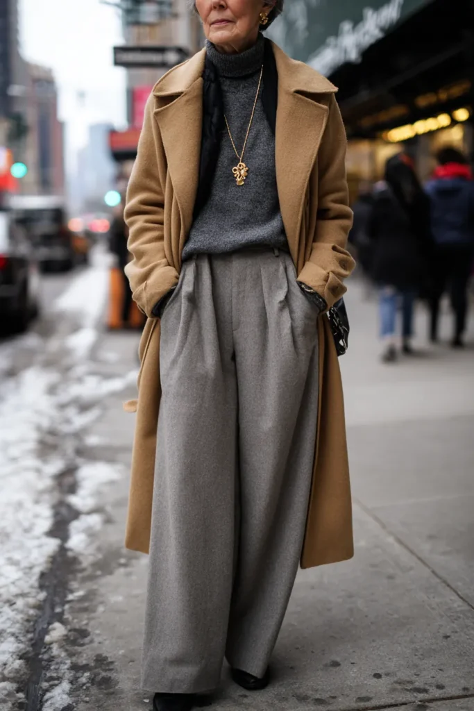 This outfit brings timeless tailoring to life. She’s wearing a camel wool coat layered over a gray turtleneck and high-waisted wide-leg trousers in a matching shade of gray. The soft, structured fabrics and the neutral palette make this look both luxurious and understated. The gold jewelry adds just the right amount of warmth and polish, tying the outfit together with quiet confidence.