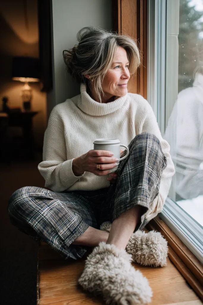 This outfit is all about warmth and ease. She’s wearing a soft cream turtleneck sweater paired with relaxed plaid pajama-style pants and fuzzy slippers that look irresistibly comfortable. The cozy fabrics and muted colors create that perfect “snow day at home” vibe. With her hair loosely tied back and a mug in hand, the whole look feels effortlessly natural and inviting.