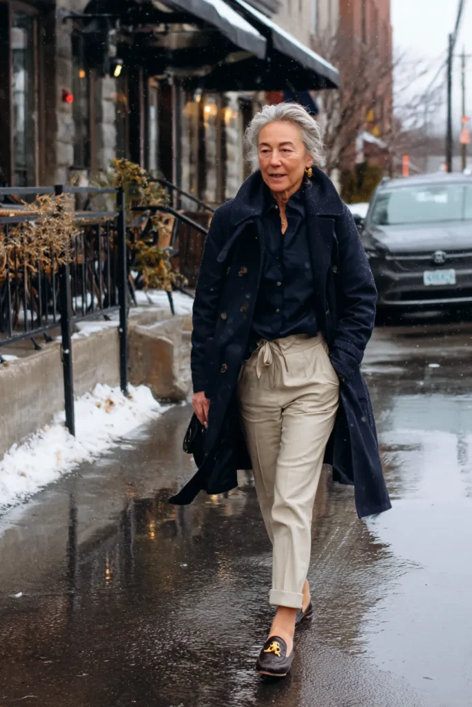 This outfit blends classic tailoring with a relaxed touch that feels modern and polished. She’s wearing a navy button-up tucked into light beige paperbag trousers, paired with a matching navy trench coat that flows beautifully as she walks. The brown loafers with gold accents add just the right amount of refinement, keeping the look elevated without trying too hard. The neutral palette and structured layers make it an instant winter classic that looks chic in any city setting.