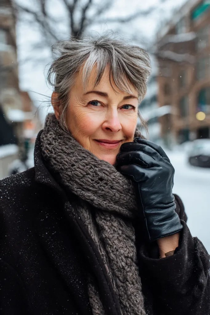 This outfit is the perfect mix of sophistication and coziness. She’s wearing a dark wool coat layered with a chunky knit scarf in deep taupe and finished with sleek black leather gloves. The combination of textures—soft wool against smooth leather—creates such an elevated look, while the neutral color palette keeps it timeless and elegant. It’s the kind of outfit that looks as stylish on a snowy city street as it does walking through a winter market.