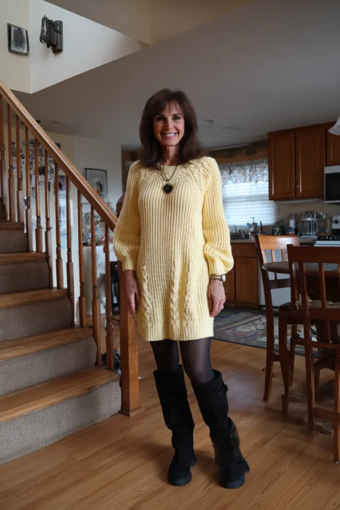 This look is bright, cozy, and full of personality. She’s wearing a soft yellow cable-knit sweater dress that hits just above the knee, paired with sheer black tights and tall black suede boots. The dress’s warm texture and sunny color instantly lift the mood, while the boots give the outfit structure and balance. A simple pendant necklace ties it all together, adding a little extra polish without overcomplicating things.