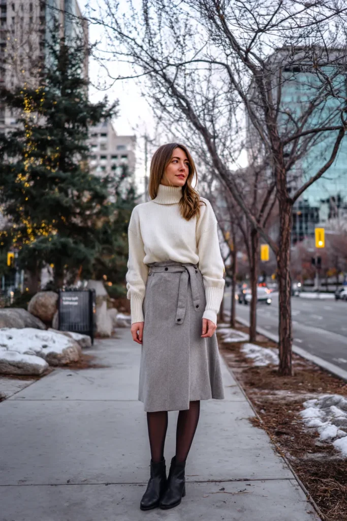 There’s something so timeless about this look. The woman is wearing a chunky cream turtleneck sweater with a textured knit that looks perfectly soft and warm. It’s tucked slightly into a mid-length gray wool skirt with a subtle checkered pattern, giving that effortless winter charm. She finishes the outfit with sheer black tights and simple black ankle boots, balancing comfort and polish. The muted tones blend beautifully with the cozy street setting, creating that “real winter day” aesthetic that feels both stylish and down to earth.
