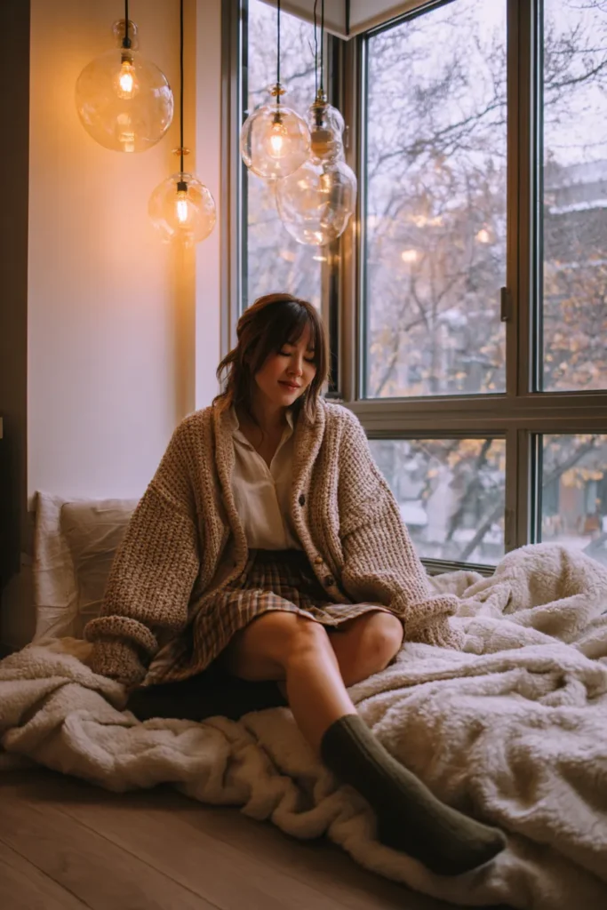 This outfit is the ultimate cozy winter-at-home look with a hint of charm. The woman is wearing a beige plaid mini skirt paired with a soft cream blouse and an oversized chunky knit cardigan that looks like a warm hug. Her thick wool socks complete the comfy vibe, making the outfit perfect for lounging by the window on a cold day. The soft lighting and textures create such a dreamy, intimate feel that’s effortlessly stylish and snug.