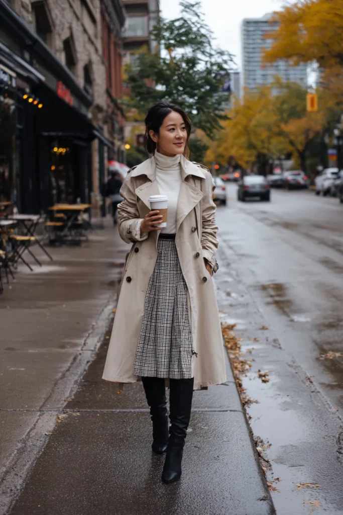 This outfit is the perfect mix of classic and modern elegance. The woman is wearing a beige trench coat layered over a white turtleneck top and a high-waisted plaid skirt that hits just below the knee. Her black knee-high boots pull everything together beautifully, giving a polished finish that’s both cozy and sophisticated. The neutral tones blend perfectly with the moody city backdrop, and the coffee cup in hand adds that effortless “on-the-go” vibe we all love in fall and winter fashion.