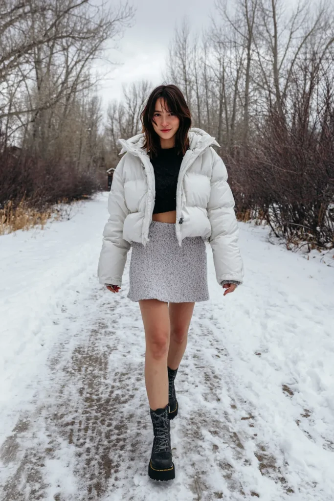 This outfit is the perfect mix of cozy and cool-girl confidence. The woman is wearing a fluffy white puffer jacket over a black cropped sweater, paired with a soft gray mini skirt that adds a feminine touch. Her black lace-up combat boots bring in that edgy street-style vibe, creating a fun contrast against the snowy backdrop. The whole look feels playful yet practical, perfect for those crisp winter days when you still want to show a bit of personality.