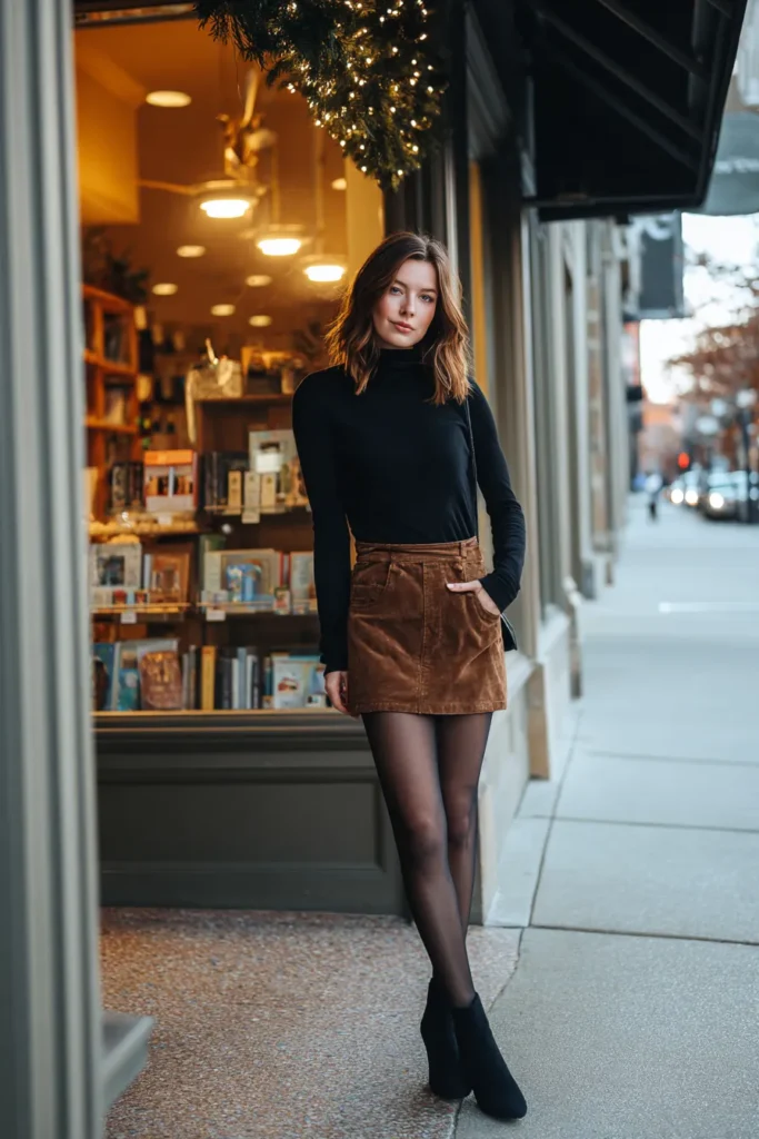 This outfit perfectly blends classic charm with modern minimalism. The woman is wearing a high-waisted brown corduroy mini skirt paired with a fitted black turtleneck, creating a sleek and flattering silhouette. She completes the look with sheer black tights and ankle boots, keeping it elegant yet simple. The warm tones of the skirt contrast beautifully with the cool black top, making this a timeless combo that works for both day and night.