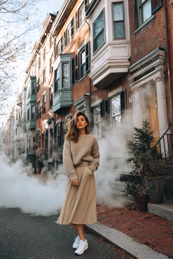 This outfit is the ultimate example of effortless winter chic. The woman is wearing a chunky beige knit sweater tucked slightly into a light tan pleated midi skirt that flows beautifully as she walks. She keeps the look modern and casual with clean white sneakers, blending comfort with style. The soft neutral tones give off a calm, cozy vibe, while the mix of textures adds visual interest. It’s simple, timeless, and perfect for everyday wear.