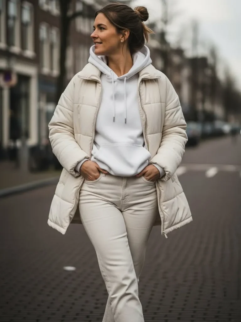 A white puffer jacket layered over a hoodie and light trousers creates a relaxed winter look that still feels fresh.