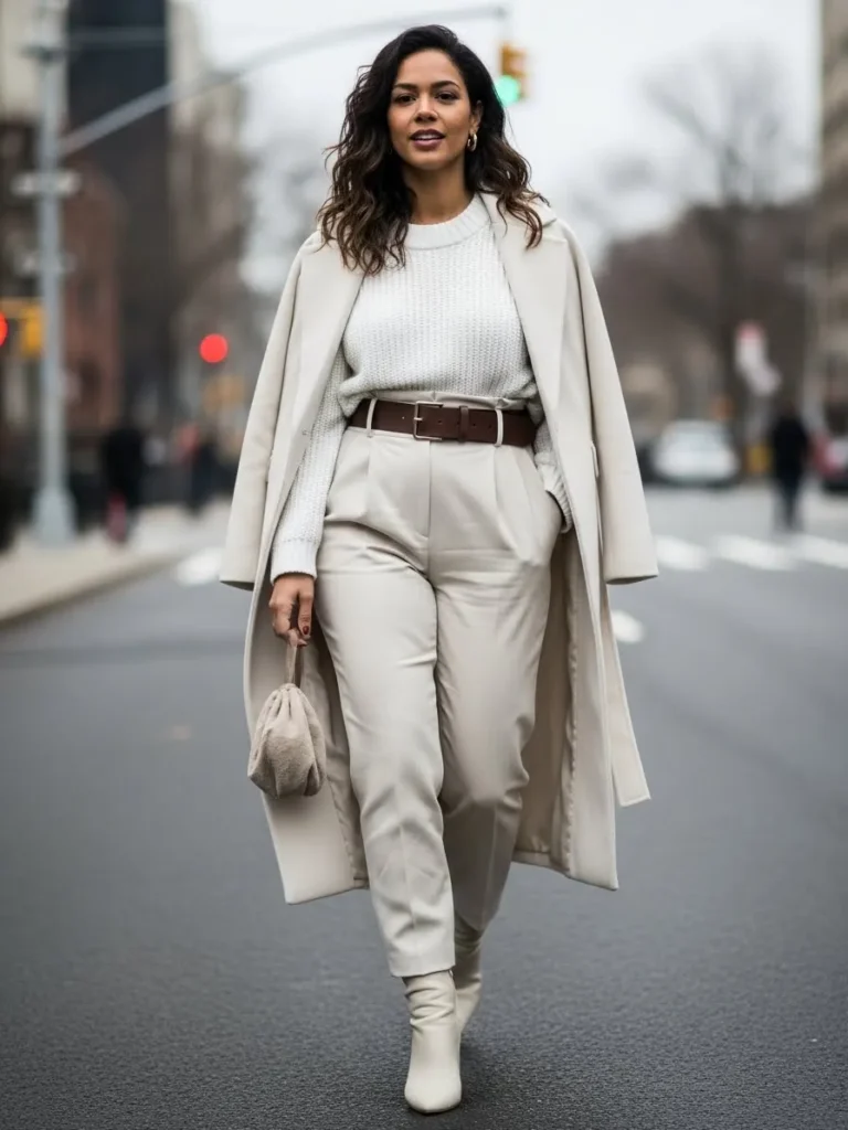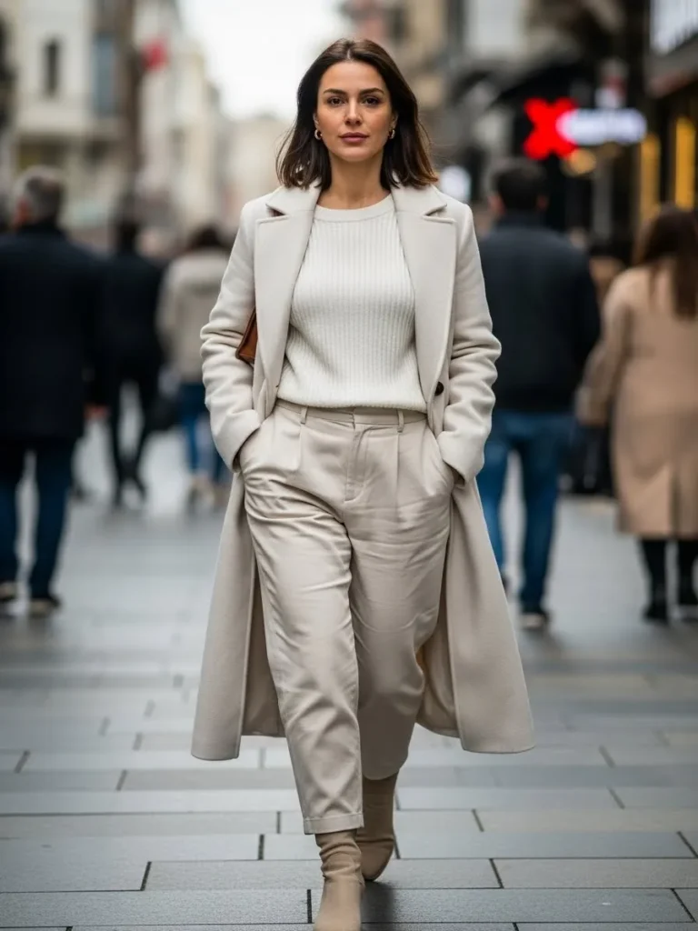 This outfit blends an ivory coat with a chunky knit sweater and relaxed cream trousers for an easy city look.