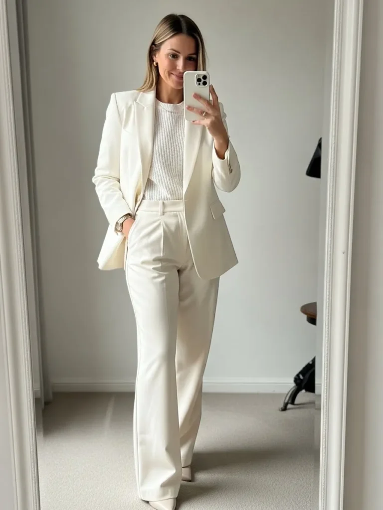 This outfit mixes a tailored white blazer with a cozy turtleneck sweater and matching trousers.